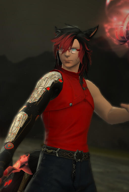 Appearance: Always dressed in some sort of flashy outfit as it is an occupational hazard of Redmagery. Always dressed in red, with black hair and red tips, he has one functional eye and scarring on his face. Noticably he has a Rapier that he channels his aether through making it glow and swirl.. showing his skill as a Redmage. Zekiel lost his arm to a curse, resulting in a prosthetic (allag/magitek) on his right arm.